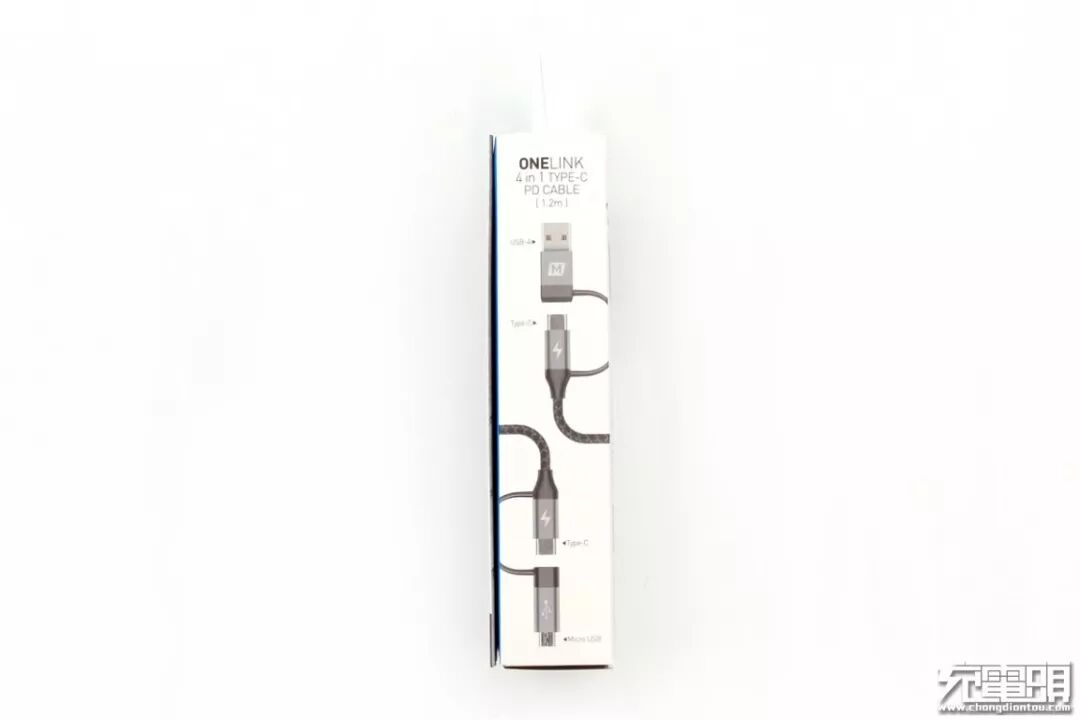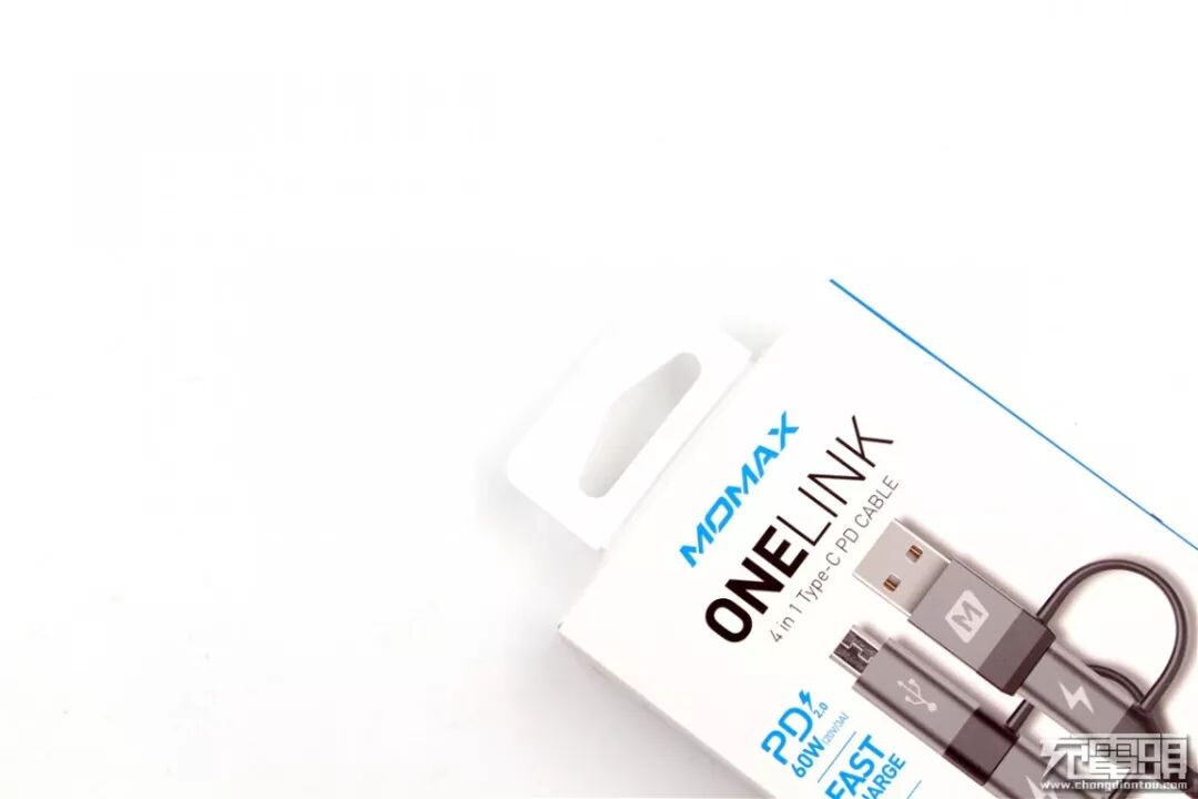 白色卡纸包装盒,从正面的产品图片中可以很直观的看出样貌,图片上方有产品的名称:MOMAX ONELINK 四合一 Type-C PD数据线,线长1.2m,可过3A电流。