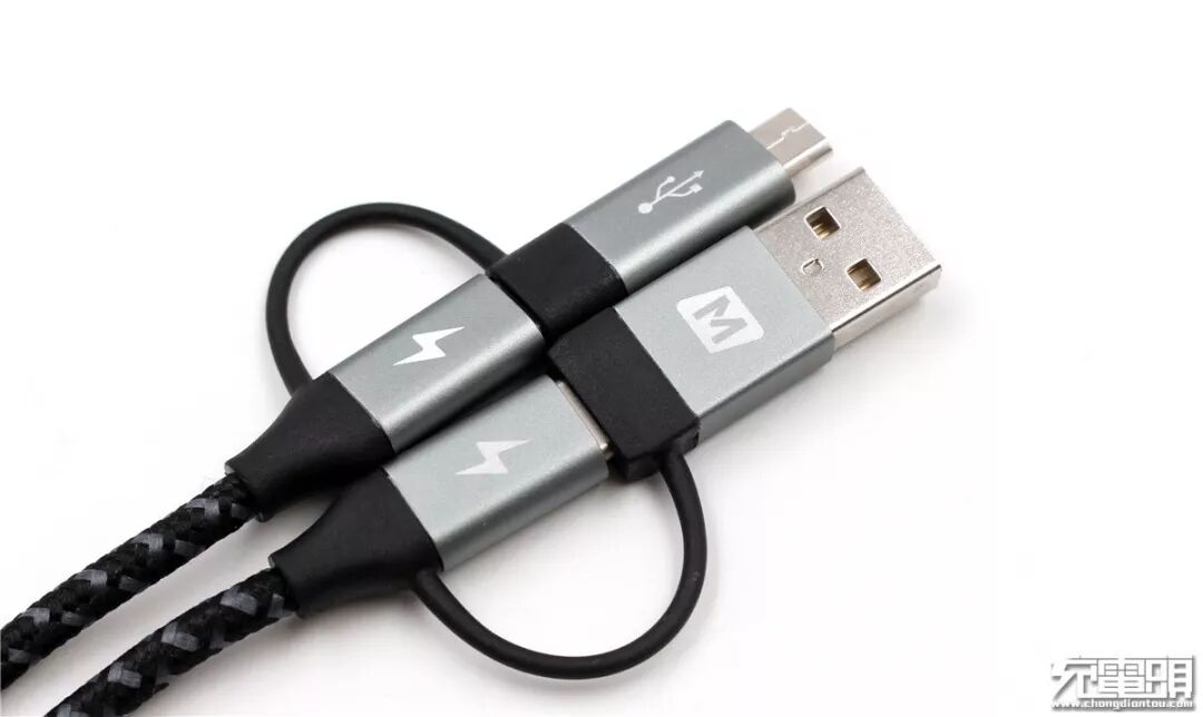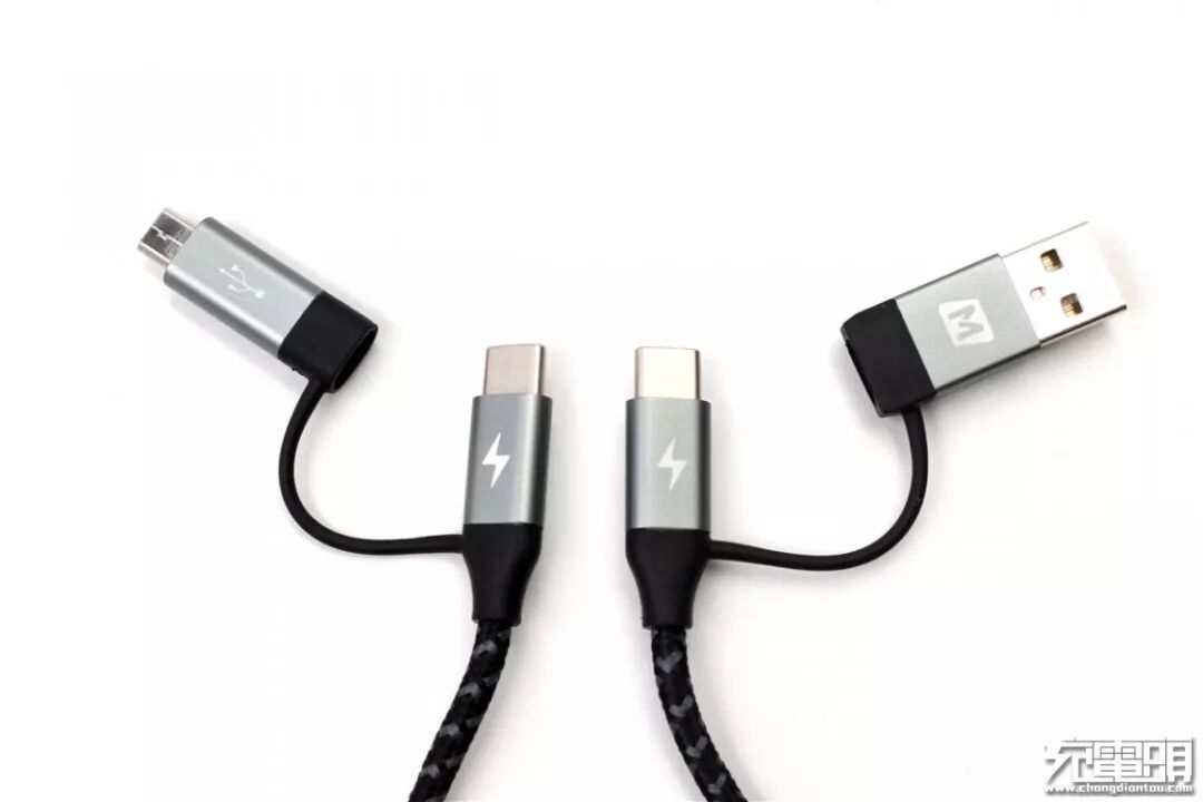 数据线共有两个USB-C口,一个USB-A口,一个Micro USB口,可以组合成USB-C to USB-C、USB-A to USB-C、USB-C to Micro USB、USB-A to Micro USB四种形态,通吃市面上在售的安卓手机。