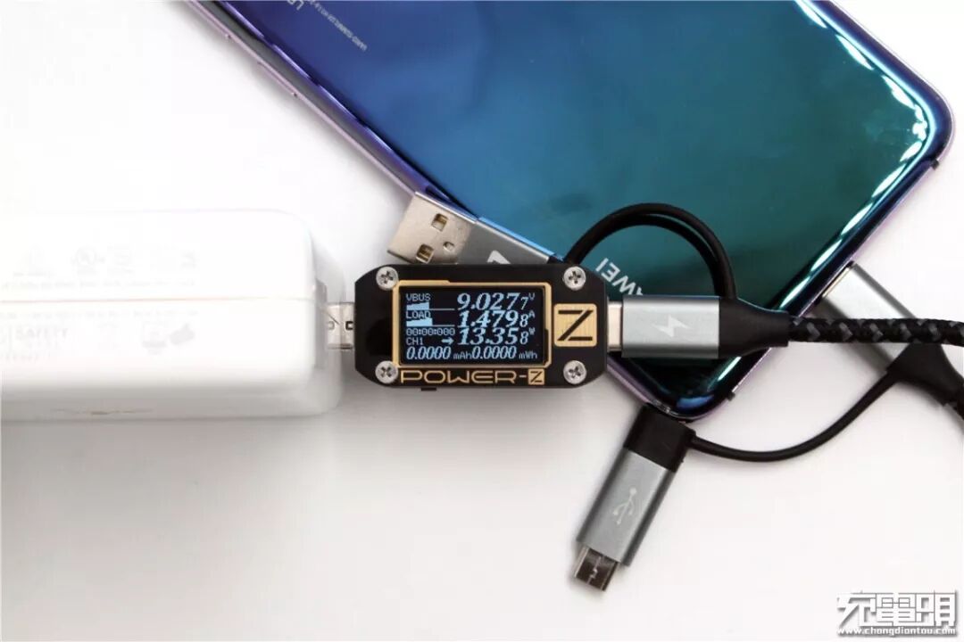 华为P20 Pro同样支持PD快充,实测功率达到了13.35W(9.02V/1.47A),开启PD快充。