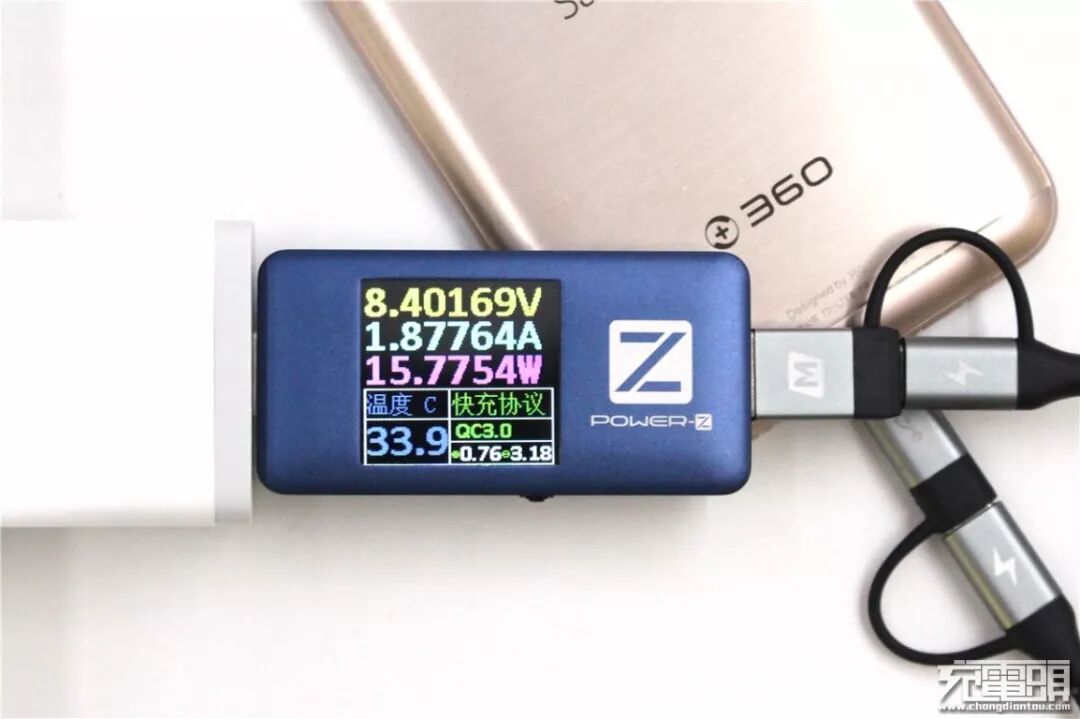最后我们在测试下USB-A to Micro USB形态下的情况,小米8原装充电器充360 N5手机,功率15.77W(8.4V/1.87A),开启QC 3.0快充。