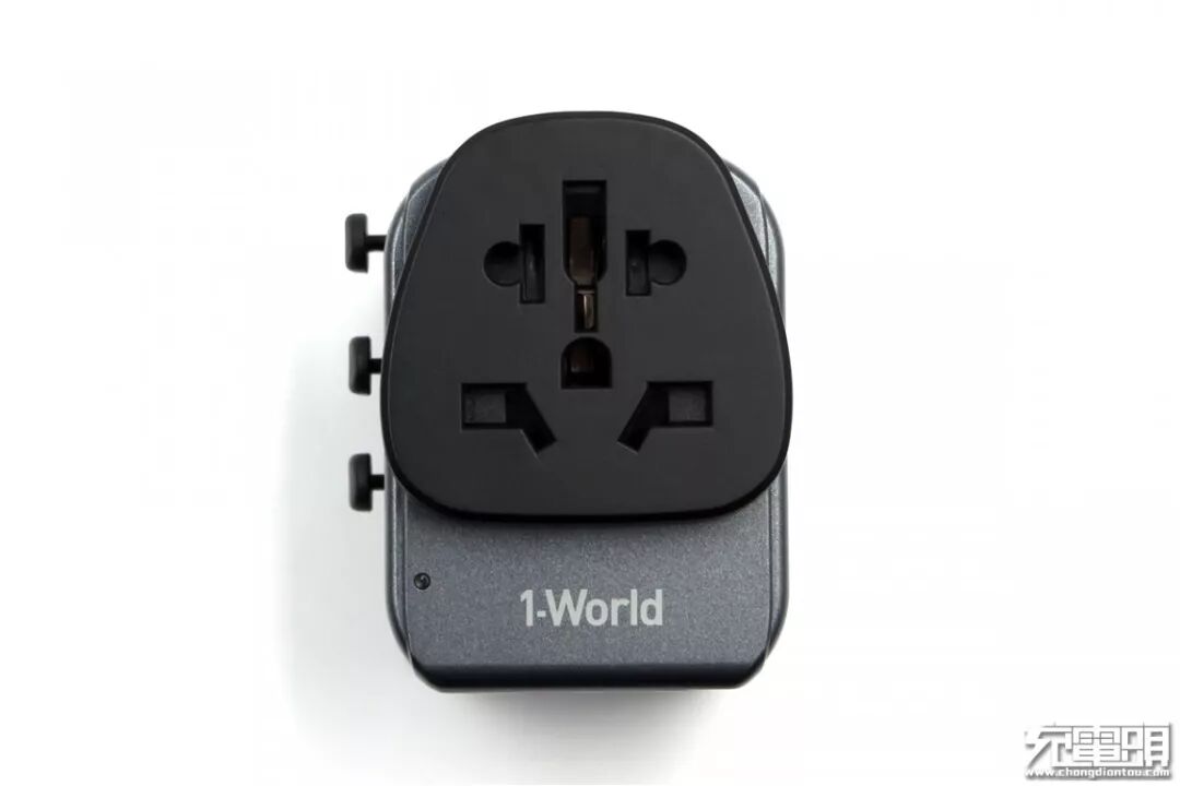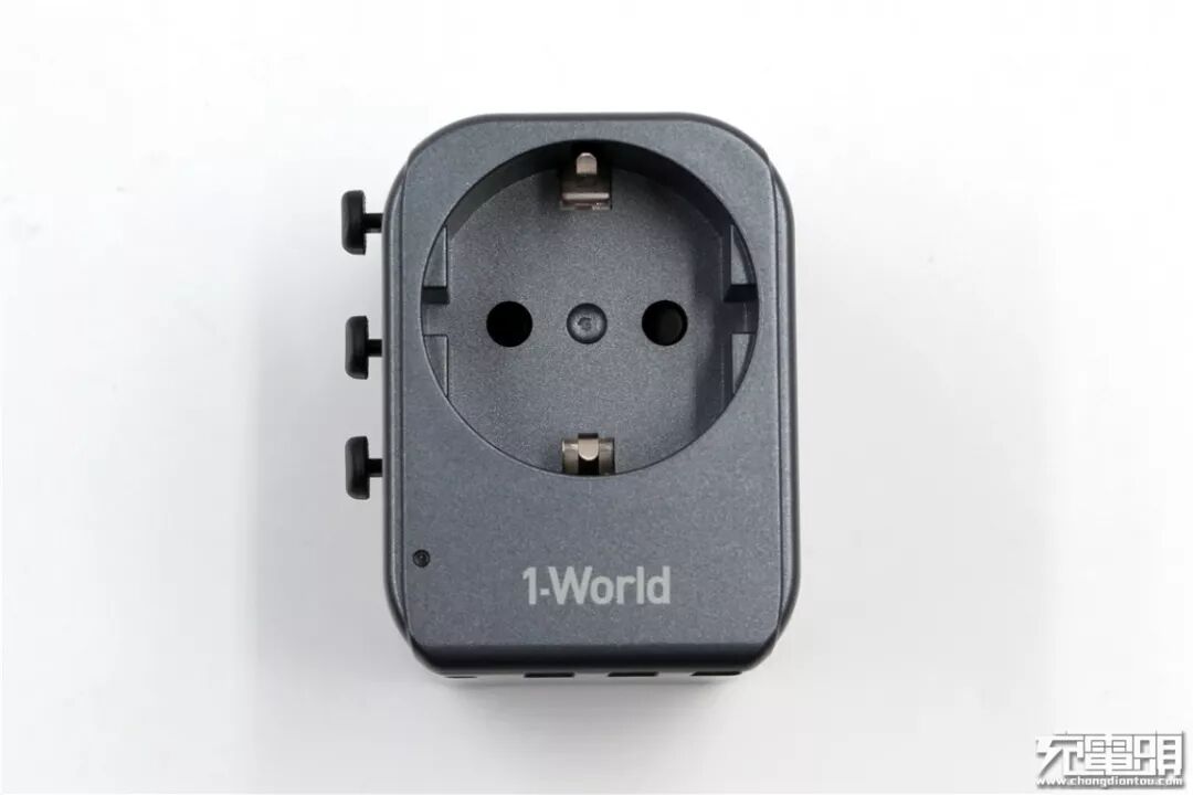 这是充电插座的插孔拓展面,印有“1-World”字样,字样的左边是电源指示灯。