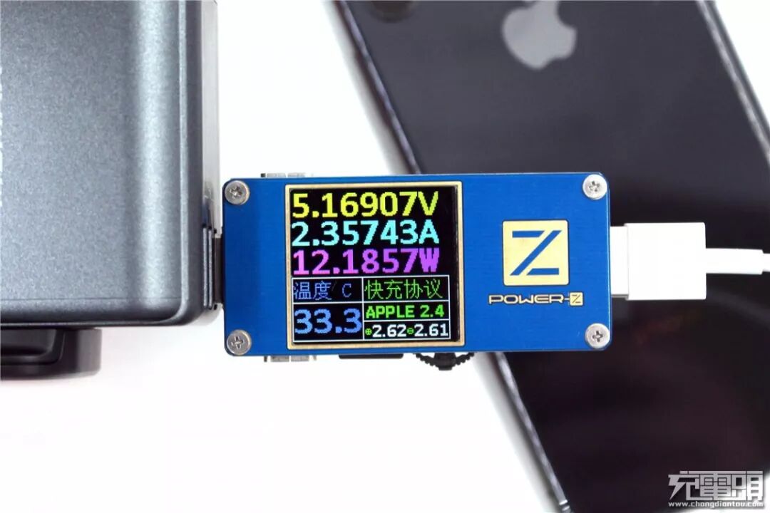 充iPhone XS,电压5.16V,电流2.35A,功率12.18W,开启Apple 2.4A协议充电。