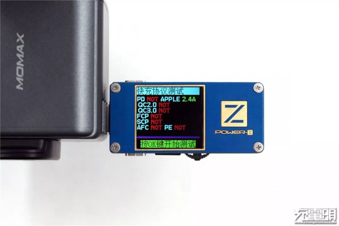 USB-C口协议测试,使用ChargerLAB Power-Z FL001S测试仪测得支持USB PD、QC 2.0、QC 3.0、FCP、AFC、MTK PE快充,以及苹果Apple 2.4A协议。