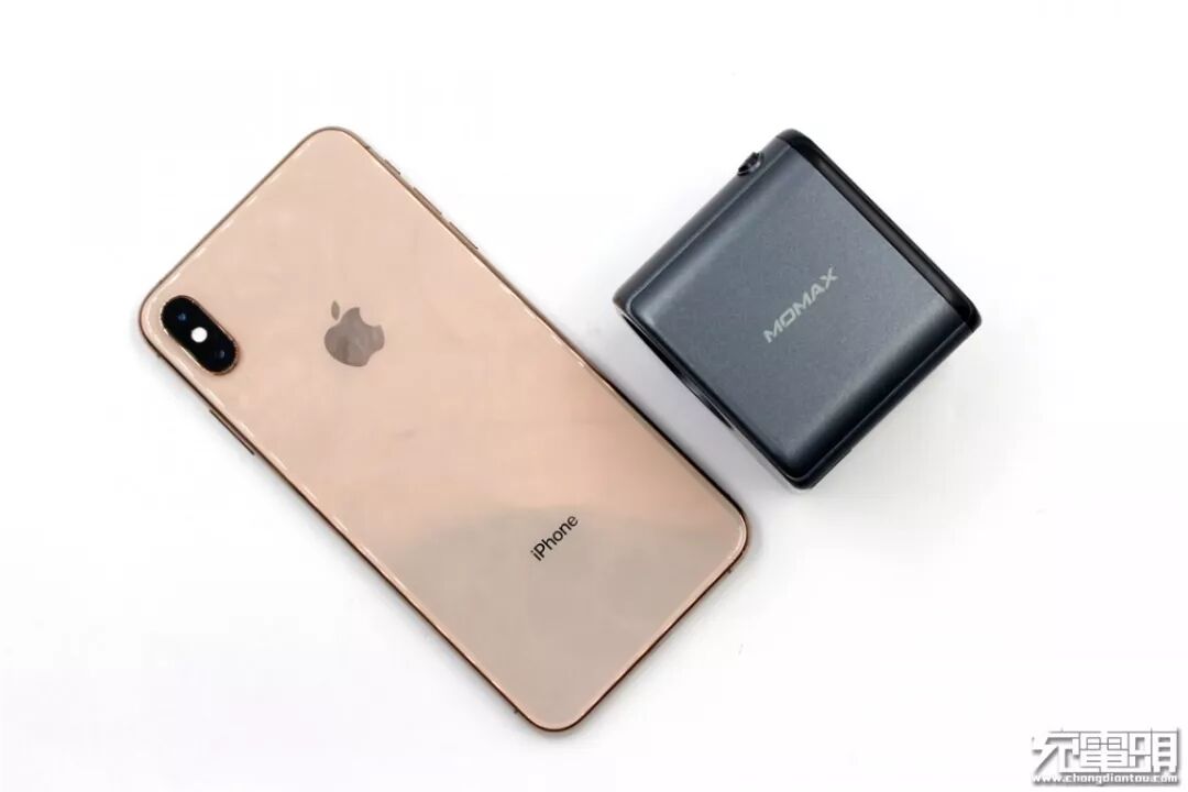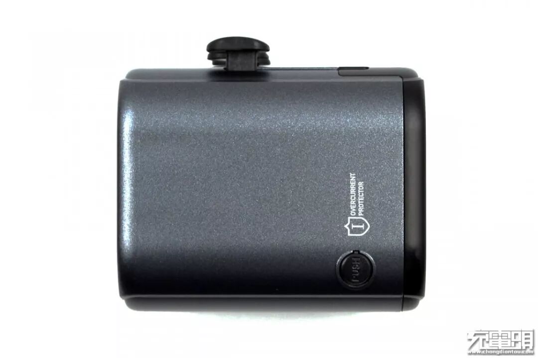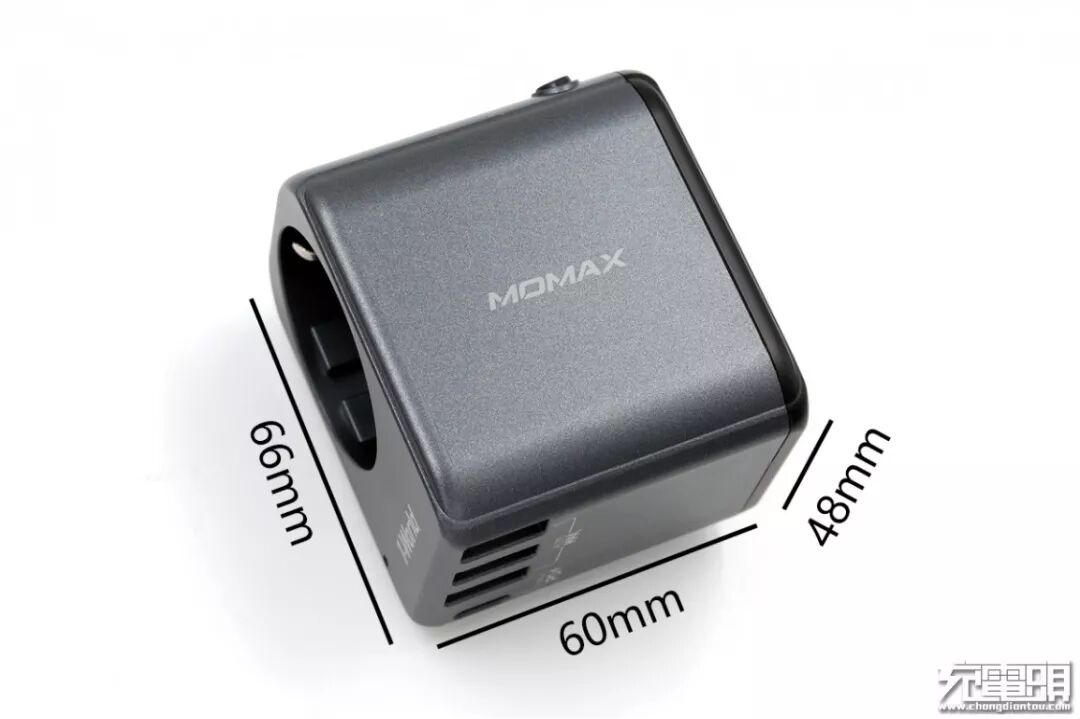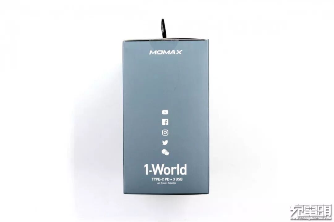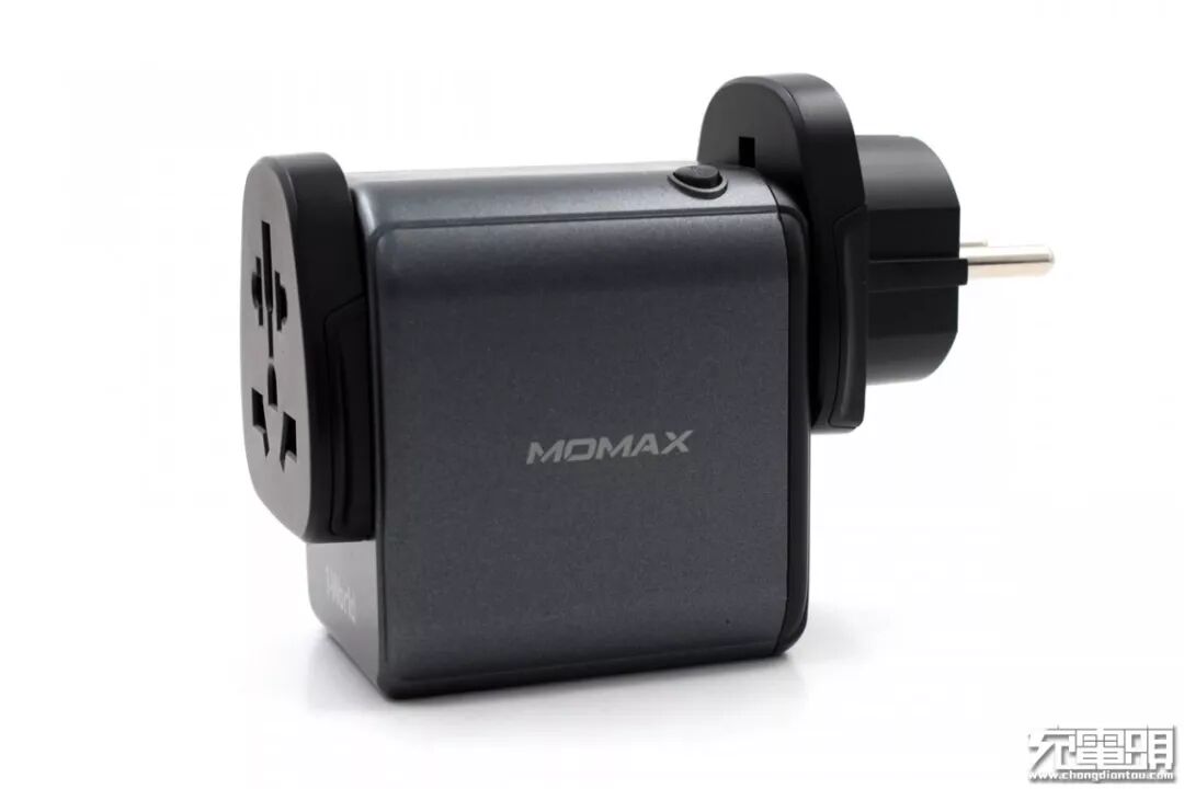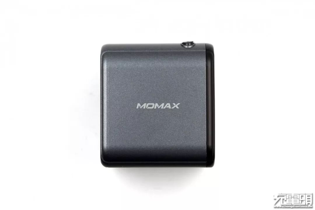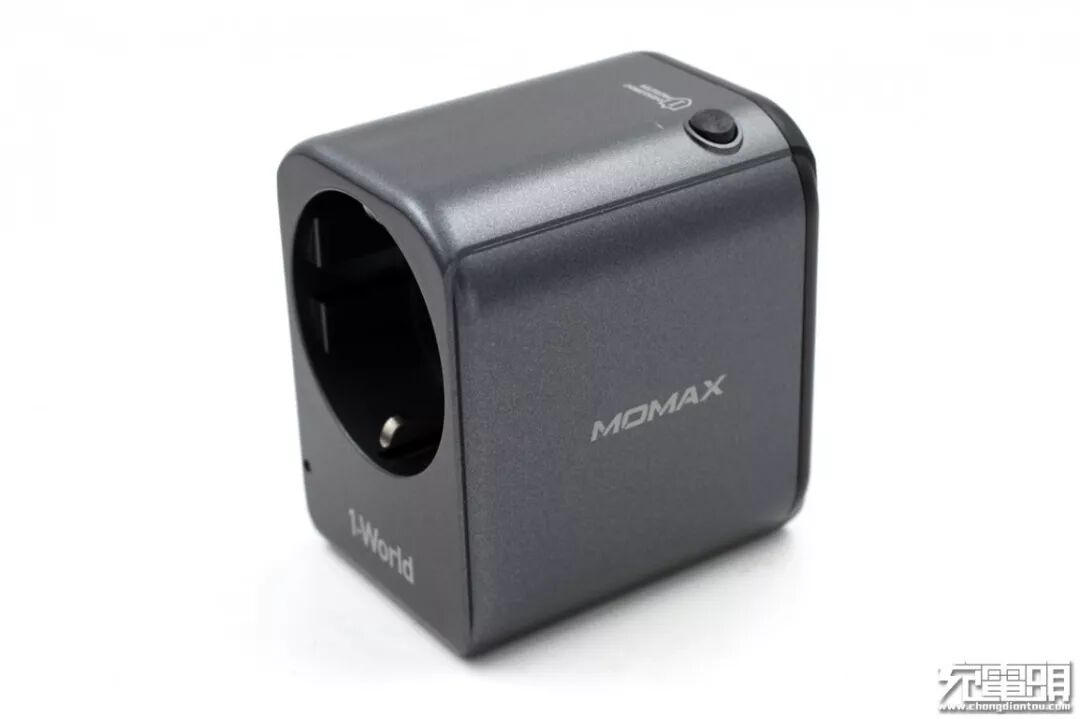 正面中间有白灰色“MOMAX”Logo涂层,有上方还有一枚过电流保护按钮。