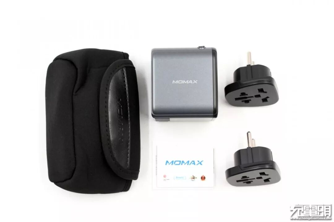 拆开包装,里面有MOMAX 1-World PD全球旅行充电插座、两个拓展插脚、收纳袋、说明保修书。