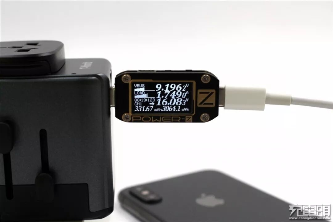 充iPhone X,电压9.19V,电流1.75A,功率16.1W,开启PD快充。