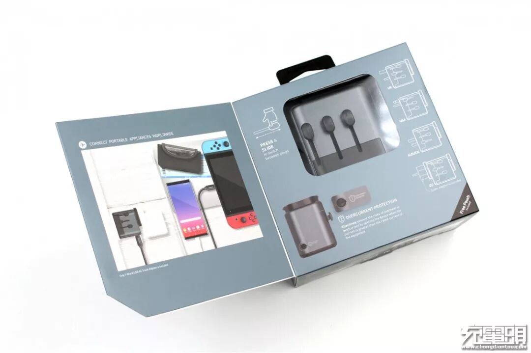 青灰色包装,正面印有产品实图,产品一目了然,两旁有产品的特点描述,从这些描述中可以大致的了解到产品支持18W USB PD、支持2.4A电流输出、重246g、能带上飞机等。包装盒顶部还带有塑料挂钩,方便实体店展示。另外,包装盒左下角贴有“仅供境外使用”字样。