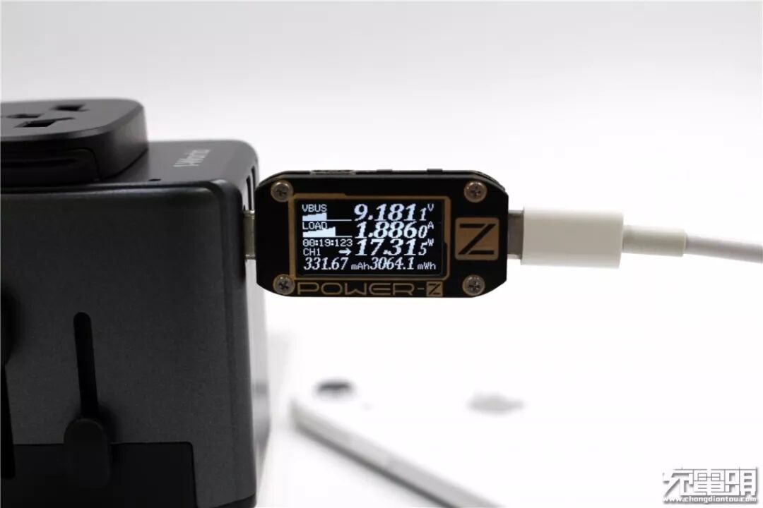 充iPhone XR,电压9.18V,电流1.88A,功率17.31W,开启PD快充。