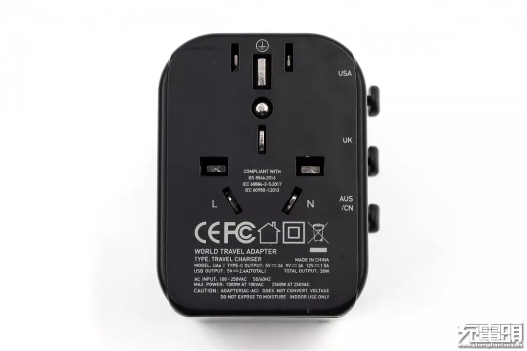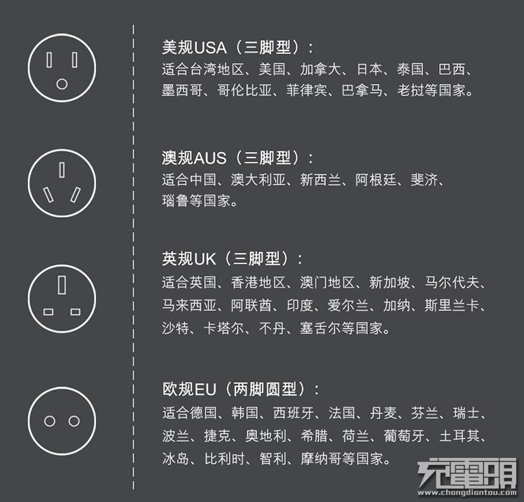背面是产品插脚的详细说明图,充电插座支持4种规格标准的插脚,分别是:美规、英规、澳规/中规、欧规(装配拓展插脚可实现)。