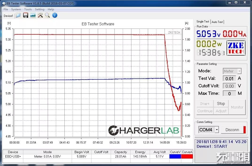 Type-C口输入接入,实测充电曲线,全程耗时15小时39分,消耗能量143.18Wh,输入转换效率约为77.5%。超大容量加上非输入快充,15小时的充电时间尽管极其漫长,但也符合台电C30作为应急后备电源的定位。