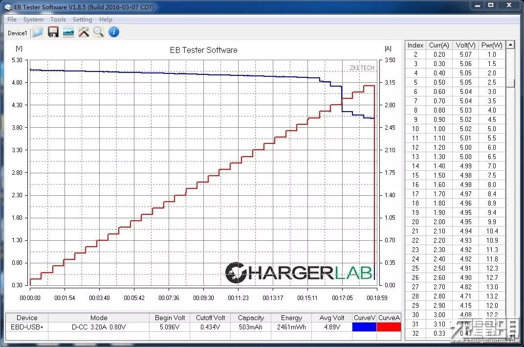 台电C30电芯容量标称为30000mAh,在5V/2.1A负载下额定容量为18000mAh;实测数据为在5V/2.1A负载下额定容量为19890mAh,输出能量98.38Wh,输出转换效率约为88.6%,超过标称的额定容量,且全程输出电压平稳。