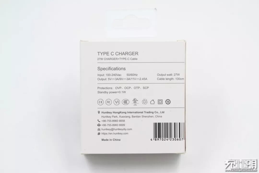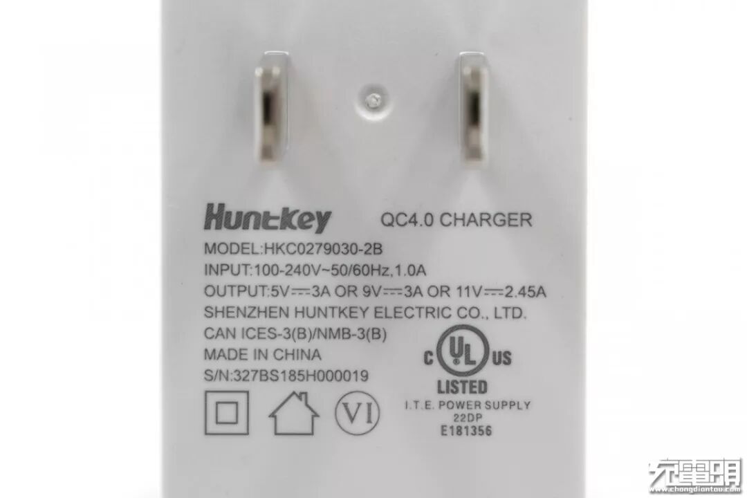 产品型号:HKC0279030,输入支持100-240V 50/60Hz;输出支持5V/3A、9V/3A、11V/2.45A、最大输出27W。产品已经通过了CE、FCC、VI(六)级能效、3C以及UL认证。