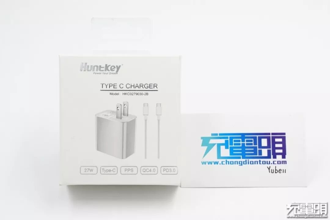 航嘉27W QC4+充电器包装盒白色简洁,正面左上角印制银色航嘉Logo:Huntkey,中心印制产品图样以及型号,随机还附赠一条USB-C to USB-C线,产品图样下方印制了5大特点:27W、Type-C、PPS、QC4.0、PD3.0。
