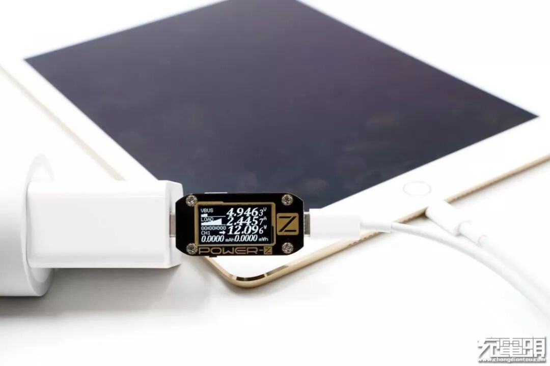 充iPad Air2,功率12.09W(电压4.94V,电流2.44A),Apple2.4A充电模式,未开启快充,原因是iPad Air2不支持PD、QC快充。