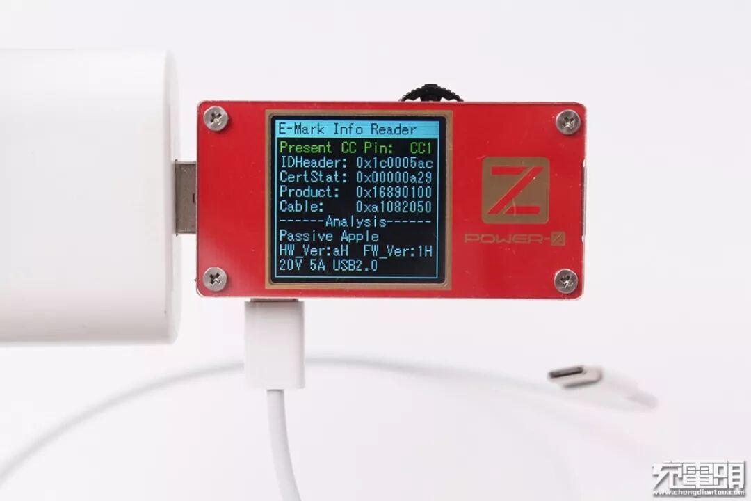 使用ChargerLAB POWER-Z KT001对其进行E-Marker信息检测,显示有E-Marker芯片,线材为最大可以过20V/5A 100W的功率,数据线方面则是USB2.0标准。