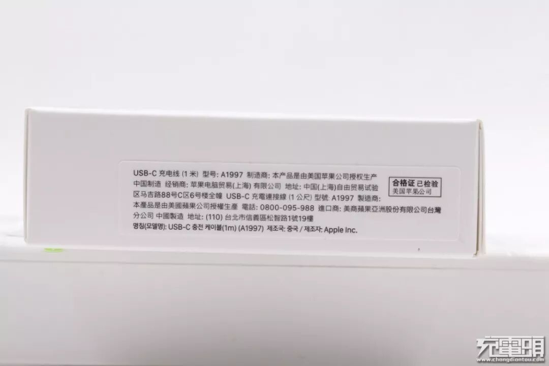 在侧面可以看到,这款充电线的型号为A1997,由美国苹果公司授权生产,中国制造。