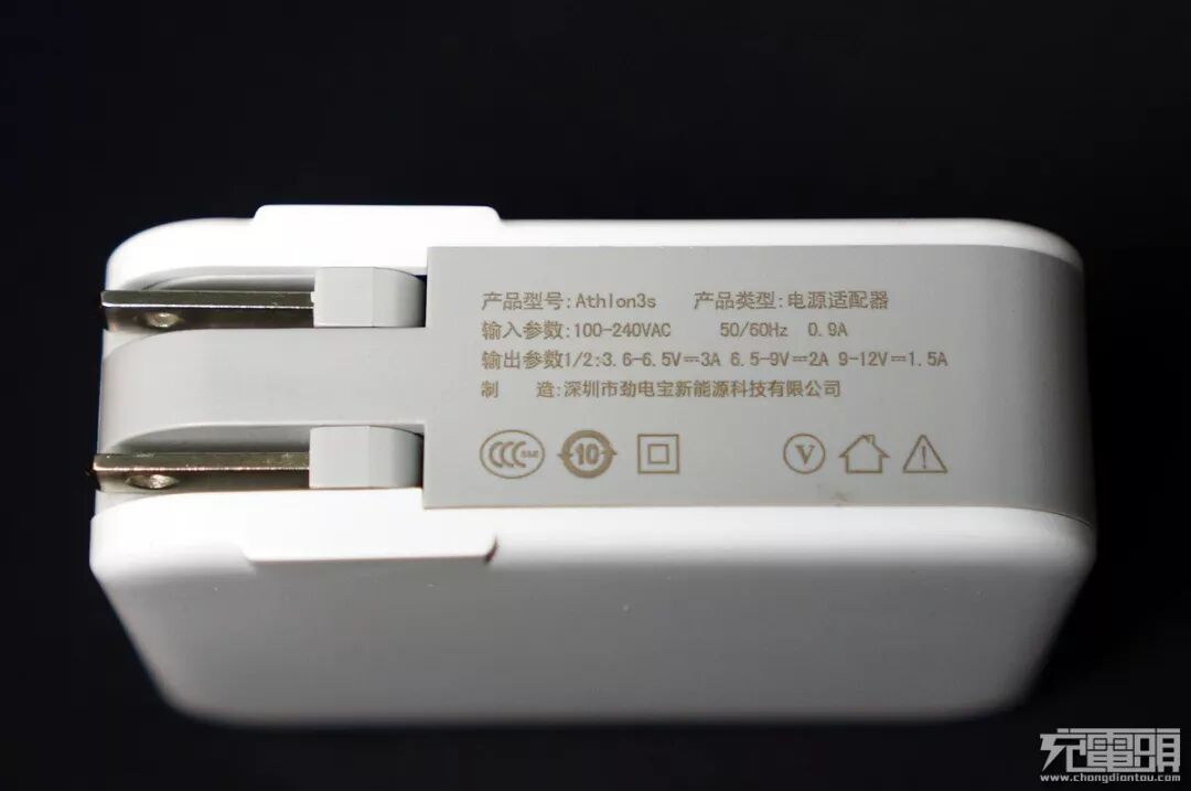 铭牌信息,产品型号:Athlon3s、输入电压100VAC~240VAC,50/60Hz,0.9A,通吃各国电压。每个口输出参数3.6~6.5V=3A、6.5-9V=2A、9~12V=1.5A。制造公司:深圳市劲电宝新能源科技有限公司。