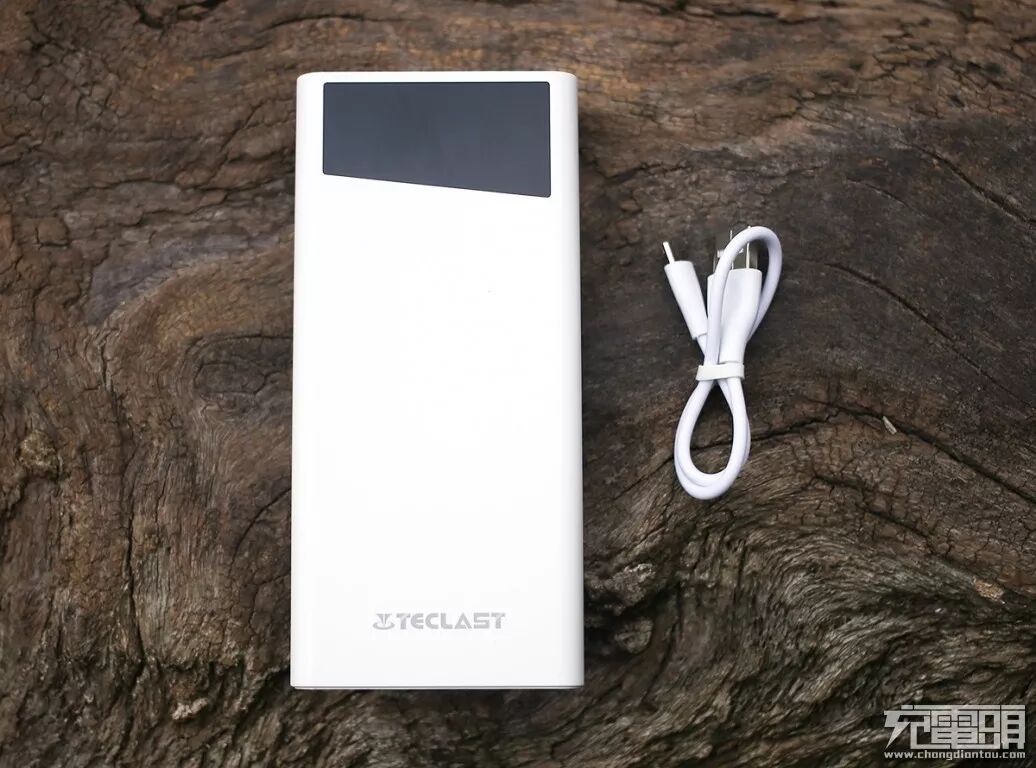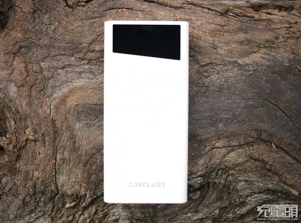 台电C30-W移动电源整体呈白色,正面有一块梯形的黑色显示屏,下部印有台电的logo。