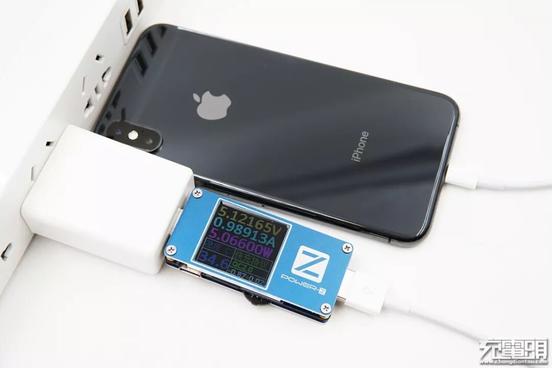 在C-Force QC to Lightning数据线实际测试之前,我们先用一根苹果原装的USB-A to Lightning数据线与QC快充充电器对新iPhone进行测试,测的当前的充电功率为5W左右,无法进入USB PD快充,iPhone不支持QC快充。
