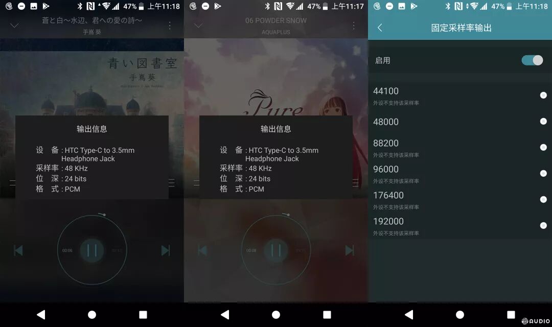HTC USB-C to 3.5mm这根转接线在播放24bit/96kHz和24bit/192kHz的FLAC时,输出的采样率都被降到了24bit/48kHz,进入海贝音乐的固定采样率输出选项中看到,这根转接线只支持48kHz这一采样率,猜测是由HTC方面锁了采样率为固定48kHz,不过24bit/48kHz仍然能达到Hi-Res的音频标准。