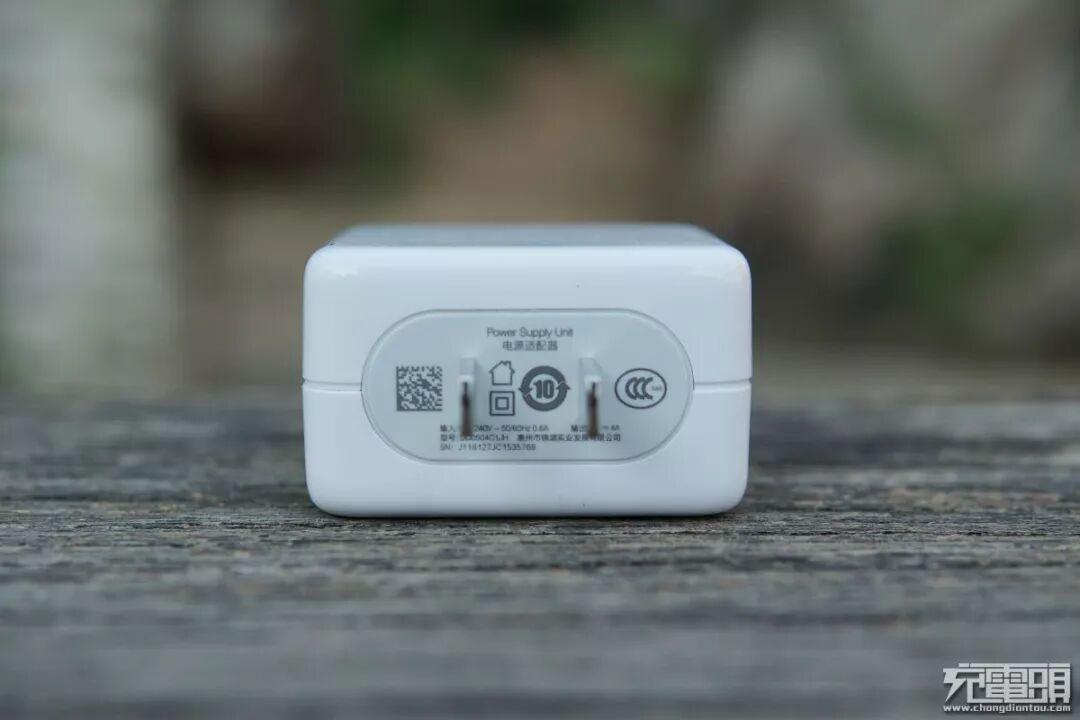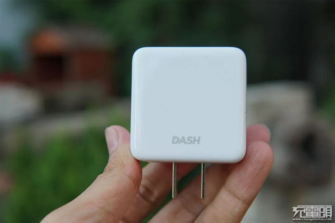 手机原装充电器外观看起来四四方方的,正面印有“DASH”的闪充标准,国标插脚,不可折叠设计。
