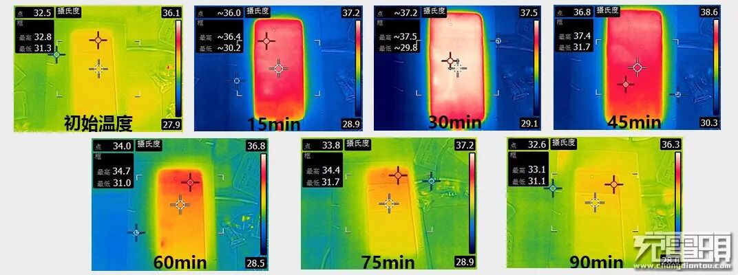 温度方面,使用FLIR测温仪测每隔15min记录一次手机温度。手机在充电之前的温度为32.8℃,随着充电时间的增加,温度逐渐上升,30min后达到37.5℃,并开始回落。充电前30min的温度呈上升趋势的原因则是因为这段时间内手机处于持续大功率充电状态,之所以在30min后温度开始渐渐回落,原因是因为之后随着充电功率减小,手机温度也处于缓慢降低。