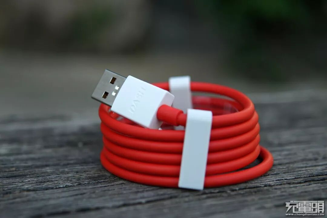 原装数据线为USB-A to USB Type-C线,线身为红色,并带有白色的理线夹,线头处为白色,并印有“DASH”字样,代表这根线支持“DASH”闪充。