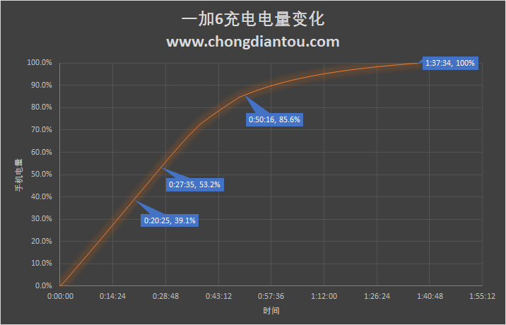 从POER-Z KM001记录下的充电曲线可知,一加6整个充电变化情况大致可分为:22分钟前、22分钟至38分钟、38分钟至65分钟,65分钟至1小时35分钟,电流根据时间的变化分别从最高的5.5A依次降到3.8A、2.5A,最后因为电量充满降到了1.2A。