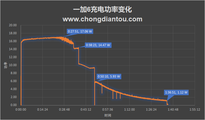 从图表中可以看到,一加6刚开始充电的时候功率会逐渐增加到17W左右,随着电量的增加,在28分钟左右功率开始呈阶梯下降。