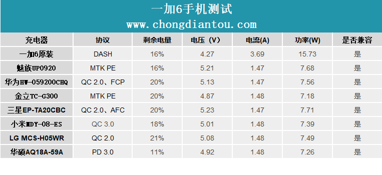 根据图表可以看出,一加6除了与自身原装的充电器可以进行快充之外,其余协议的充电器均不支持给一加6快充。