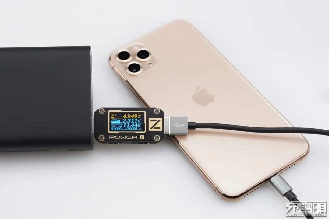 iPhone11 支持USB PD和Apple2.4A快速充电协议,使用移动电源的USB-A为iPhone11 充电,功率为4.96V 2.32A 11.54W,成功握手Apple2.4A快充协议,并达到Apple2.4A快充功率最大阶段。