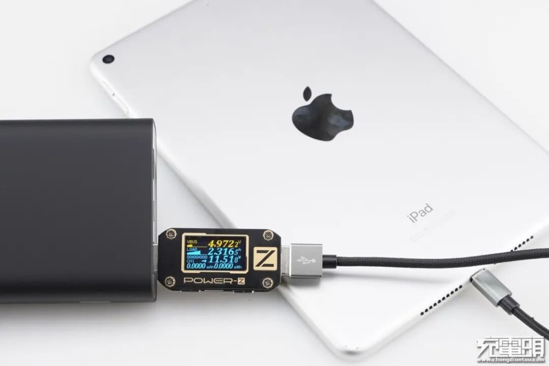 iPad mini5支持USB PD / Apple2.4A快速充电,使用移动电源的USB-A为iPad mini5充电,功率为4.97V 2.31A 11.51W,成功握手Apple2.4A快充,并达到Apple2.4A快充功率最大阶段。