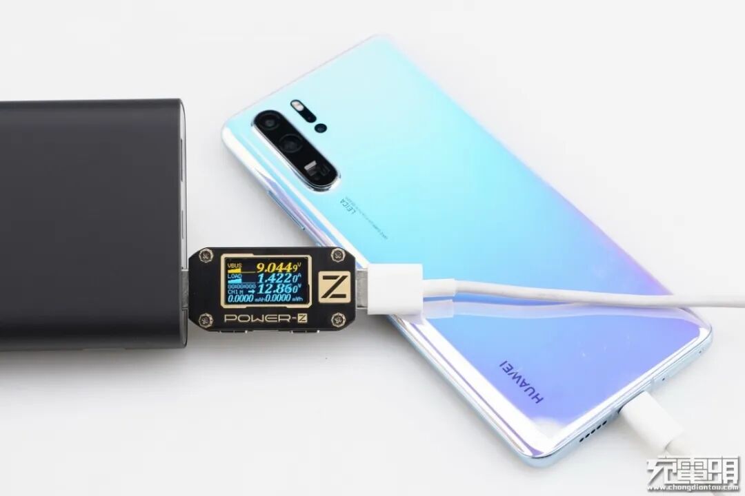 华为P30 Pro支持USB PD / FCP / SCP / 40WSCP 快速充电协议,使用移动电源的USB-A为华为P30 Pro充电,功率9.04V 1.42A 12.86W,成功握手FCP快充,并达到FCP快充功率最大阶段。
