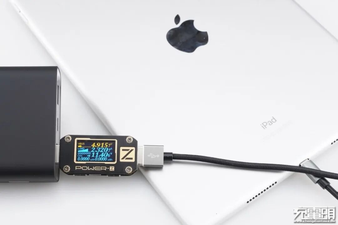 iPad Air3支持USB PD / Apple2.4A快速充电,使用移动电源的USB-A为iPad Air3充电,功率为4.91V 2.32A 11.40W,成功握手Apple2.4A快充,并达到Apple2.4A快充功率最大阶段。