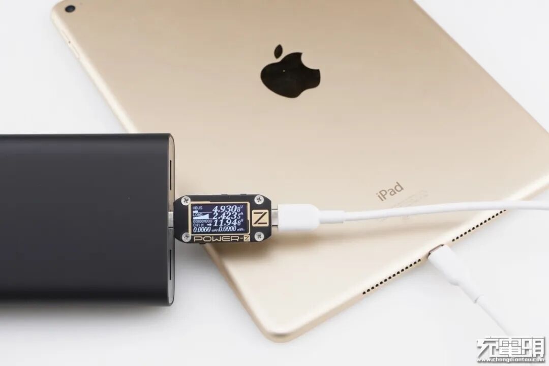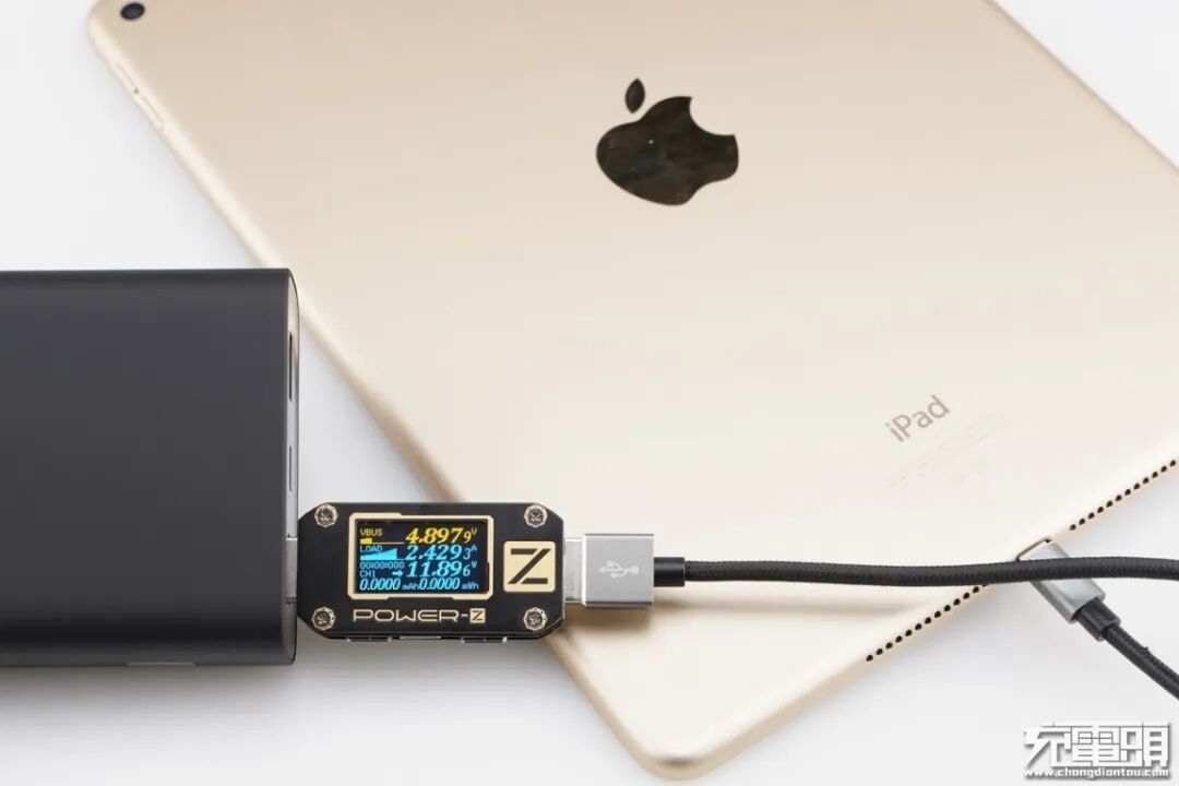 iPad Air2只支持Apple2.4A快速充电协议,使用移动电源的USB-A为iPad Air2充电,功率为4.89V 2.42A 11.89W,成功握手Apple2.4A快速充电协议,并达到Apple2.4A快充功率最大阶段。