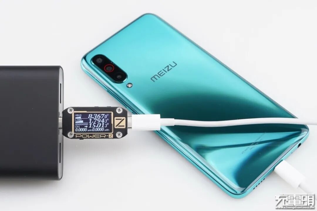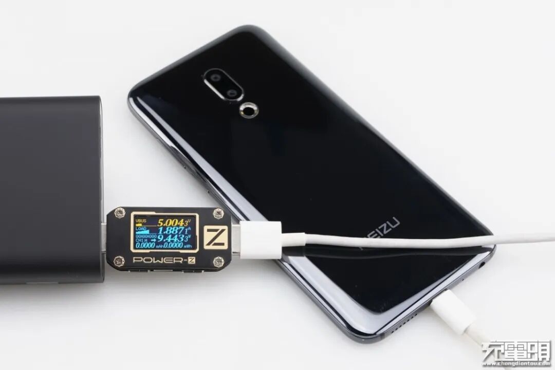魅族16th Plus只支持PE快速充电协议,使用移动电源的USB-C为魅族16th Plus充电,功率为4.96V 1.89A 9.41W,无法握手快充,运行在5V 2A模式下。