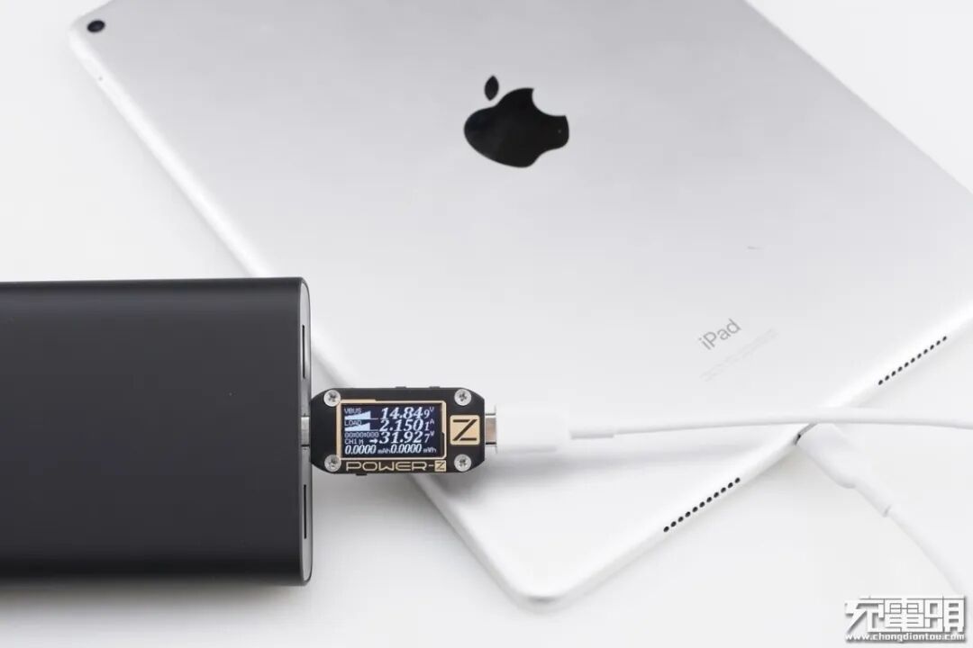 iPad Air3支持USB PD快速充电,使用移动电源的USB-C为iPad Air3充电,功率为14.84V 2.15A 31.92W,成功握手USB PD快充,并达到USB PD快充功率最大阶段。