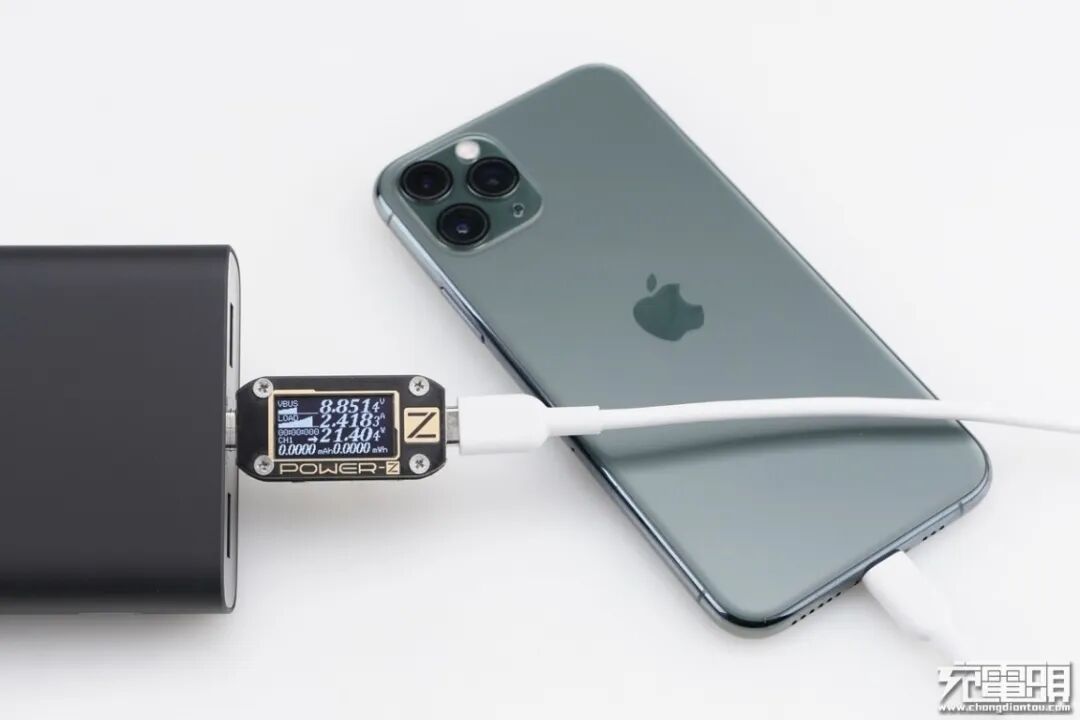iPhone11 Pro支持USB PD和Apple2.4A快速充电协议,使用移动电源的USB-C为iPhone11 Pro充电,功率为8.85V 2.41A 21.40W,成功握手USB PD快充协议,并达到USB PD快充功率最大阶段。