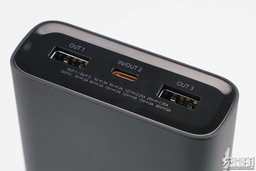 移动电源的接口面板为亮面外观设计,接口配置为两侧各带有一个USB-A输出接口,USB-C双向接口位于中间位置。