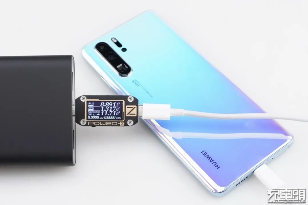 华为P30 Pro支持USB PD / FCP / SCP / 40WSCP快速充电协议,使用移动电源的USB-C为对P30 Pro充电,功率为8.89V 1.31A 11.71W,成功握手USB PD快充,并达到USB PD快充功率最大阶段。