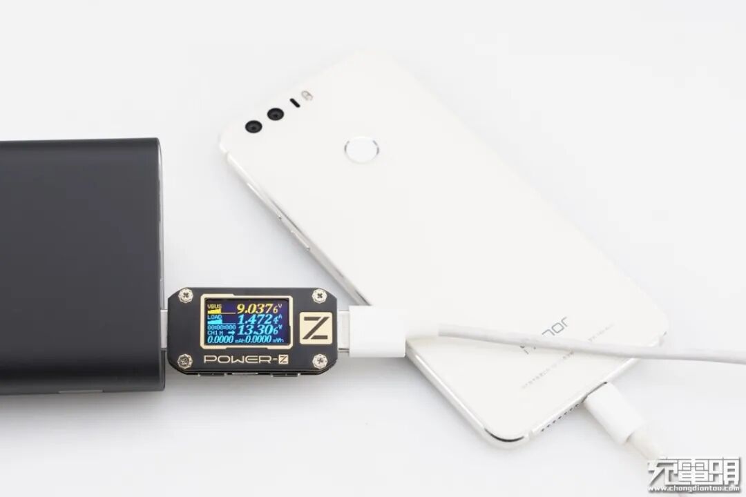 荣耀8只支持FCP快速充电协议,使用移动电源的USB-A为荣耀8充电,功率为9.03V 1.47A 13.30W,成功握手FCP快充,并达到FCP快充功率最大阶段。