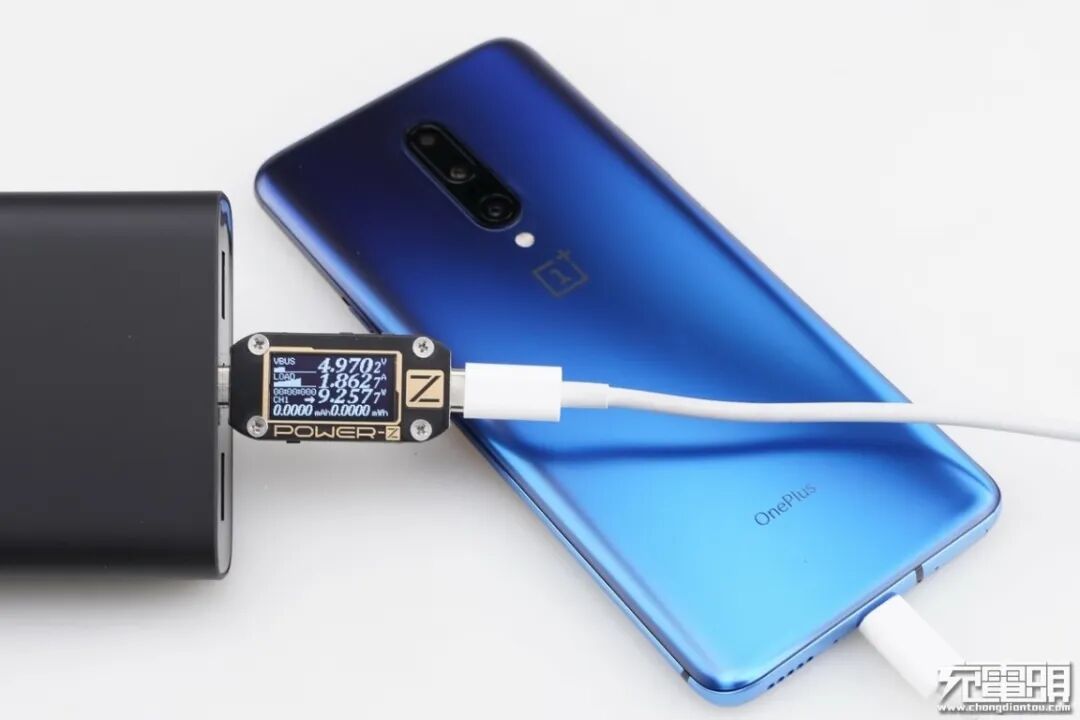 1+7 Pro支持USB PD / WARP快速充电协议,使用移动电源的USB-C为1+7 Pro充电,功率为4.97V 1.86A 9.25W,无法握手快充,运行在5V 2A模式下。