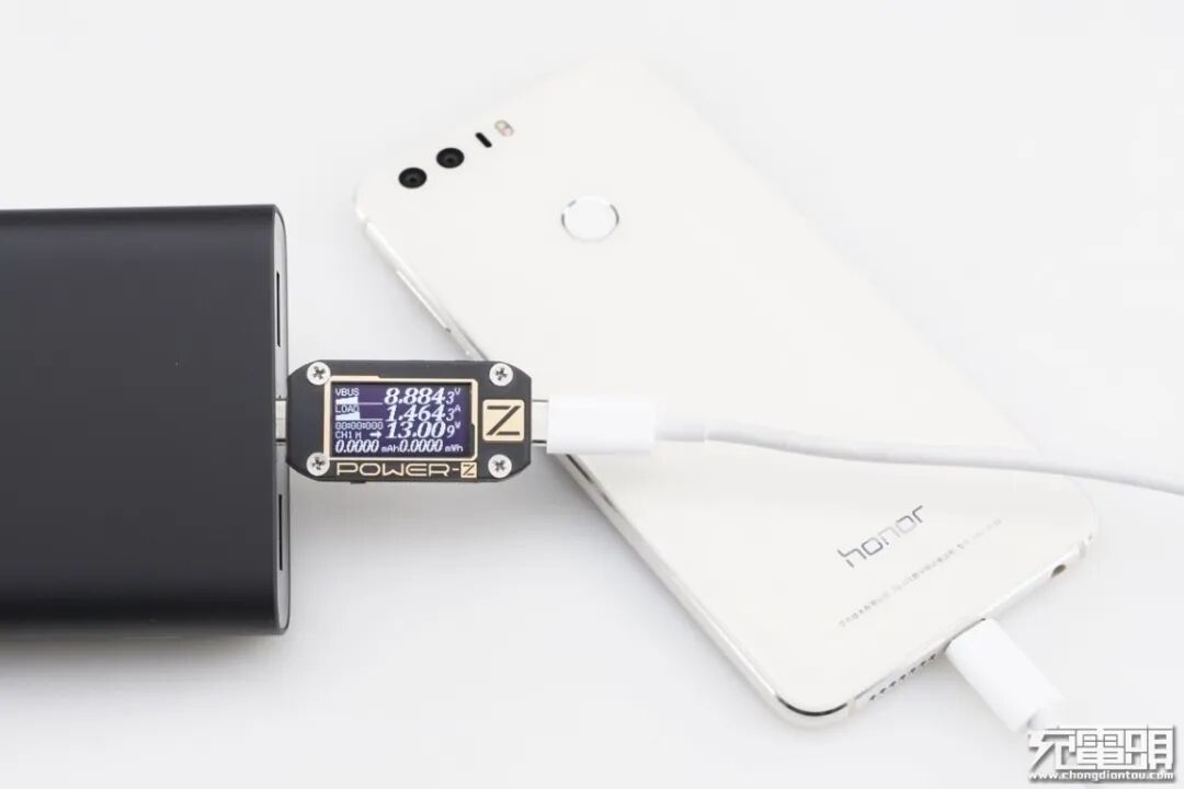 荣耀8只支持FCP快速充电协议,使用移动电源的USB-C为荣耀8充电,功率为8.88V 1.46A 13.00W,成功握手FCP快充,并达到FCP快充功率最大阶段。