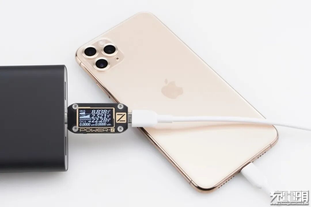 iPhone11 Pro Max支持USB PD和Apple2.4A快速充电协议,使用移动电源的USB-C为iPhone11 Pro Max充电,功率为8.83V 2.52A 22.28W,成功握手USB PD快充协议,并达到USB PD快充功率最大阶段。
