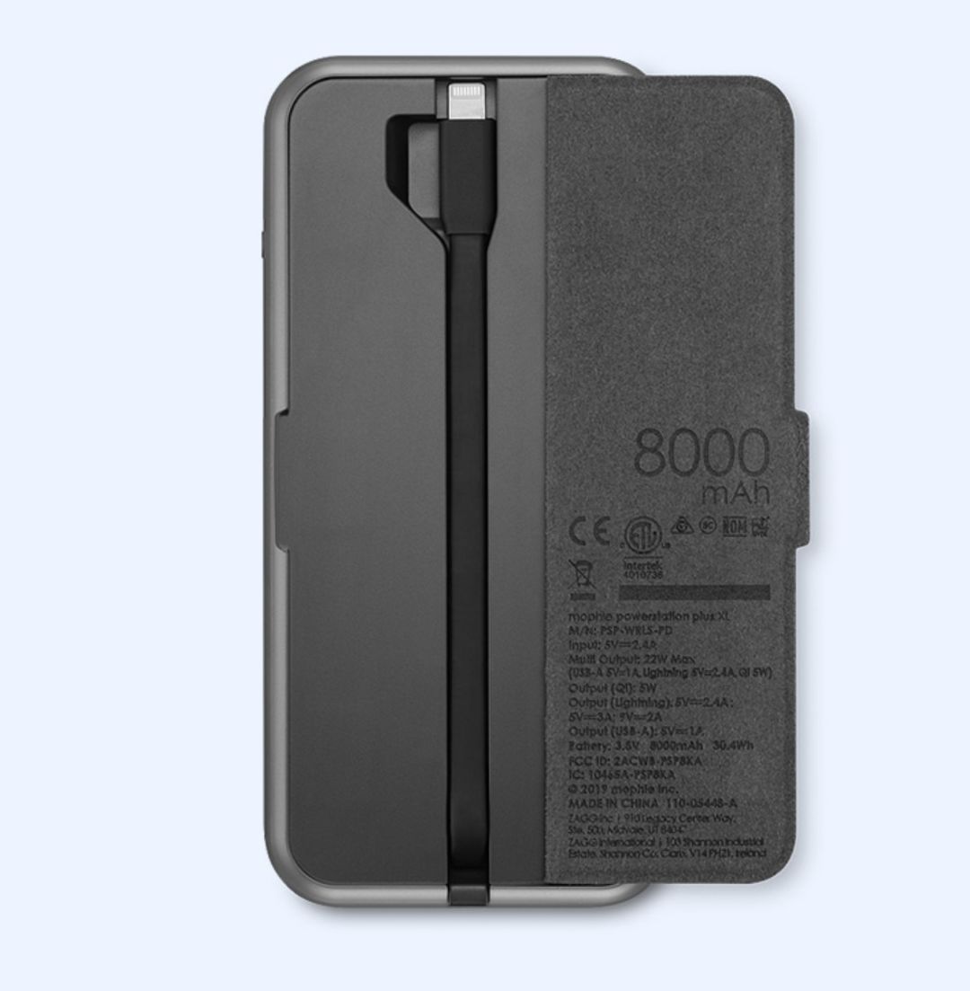mophie powerstation plus xl 移动电源,自带Lightning接口数据线,支持PD快充输出,可以为支持PD快充协议的iPhone半小时充入50%的电量。