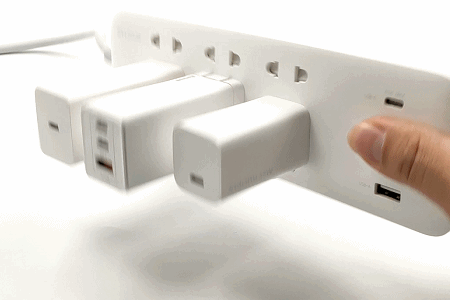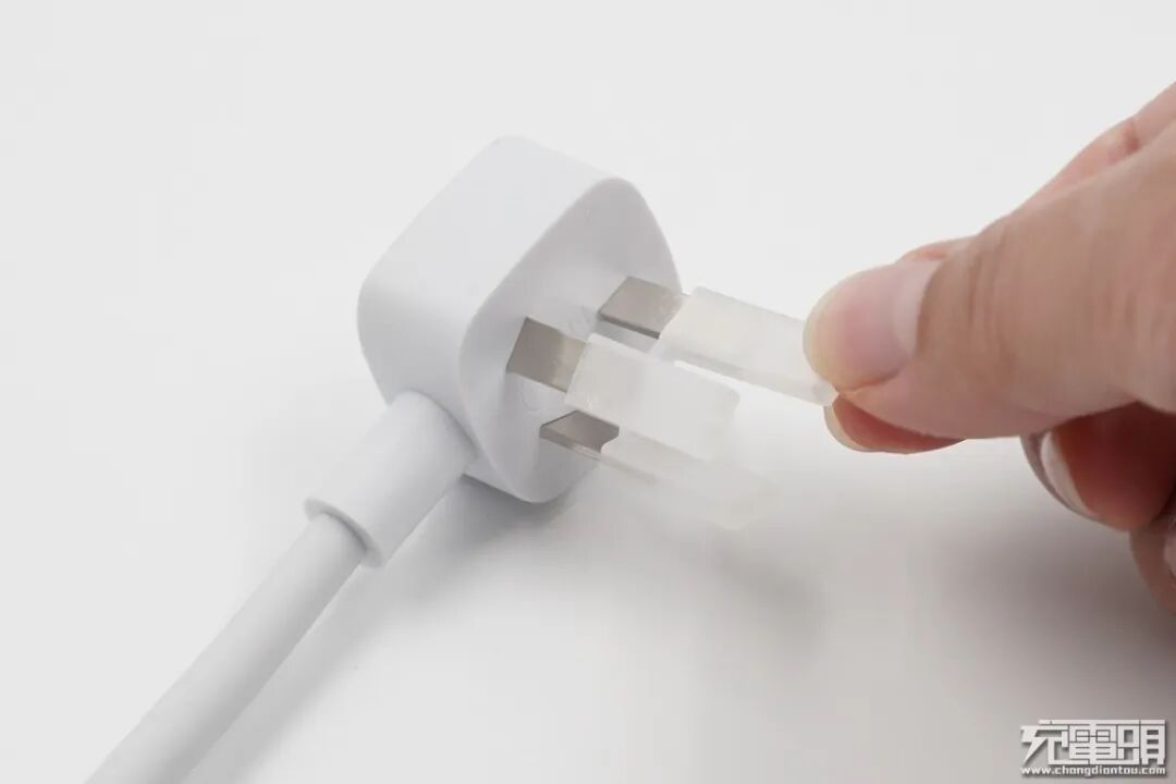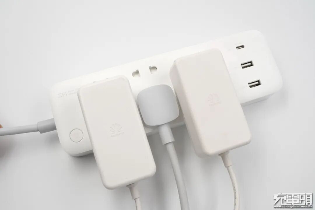 很多用户遇过某些插线板的夹持力度松松垮垮甚至接触不良,这里小编使用了三款重心偏高的条形充电器来测试紫米2A1C插线板夹持力,分别是小米氮化镓充电器、倍思氮化镓充电器、联想口红充电器。三款条形充电器插入紫米插线板使劲晃动,未见任何松动情况,可见内部的一体铜条有一定厚度,设计合理夹持力度足够。