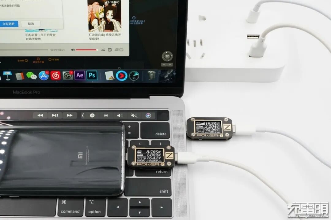 紫米65W 2A1C插线板在1A1C模式下同时对Macbook Pro13、小米9充电,USB-C对Macbook Pro13充电 功率19.35V 2.20A 42.66W,握手USB PD快充,USB-C输出口在多接口使用时最大功率从单口的65W调整为45W。USB-A为小米9充电功率8.78V 1.86A 16.41W,握手QC快充。2A1C充电模式下两个USB-A锁定5V,USB-C维持45W输出不变。