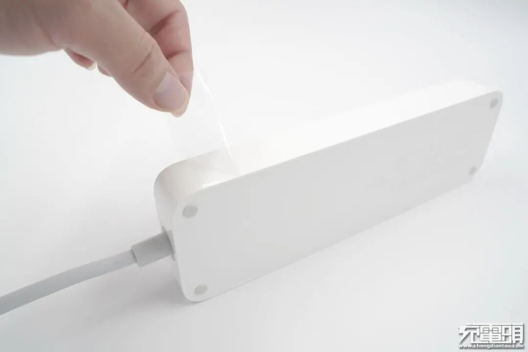 插线板侧面是亮面材质设计,带有一层防刮透明胶纸。