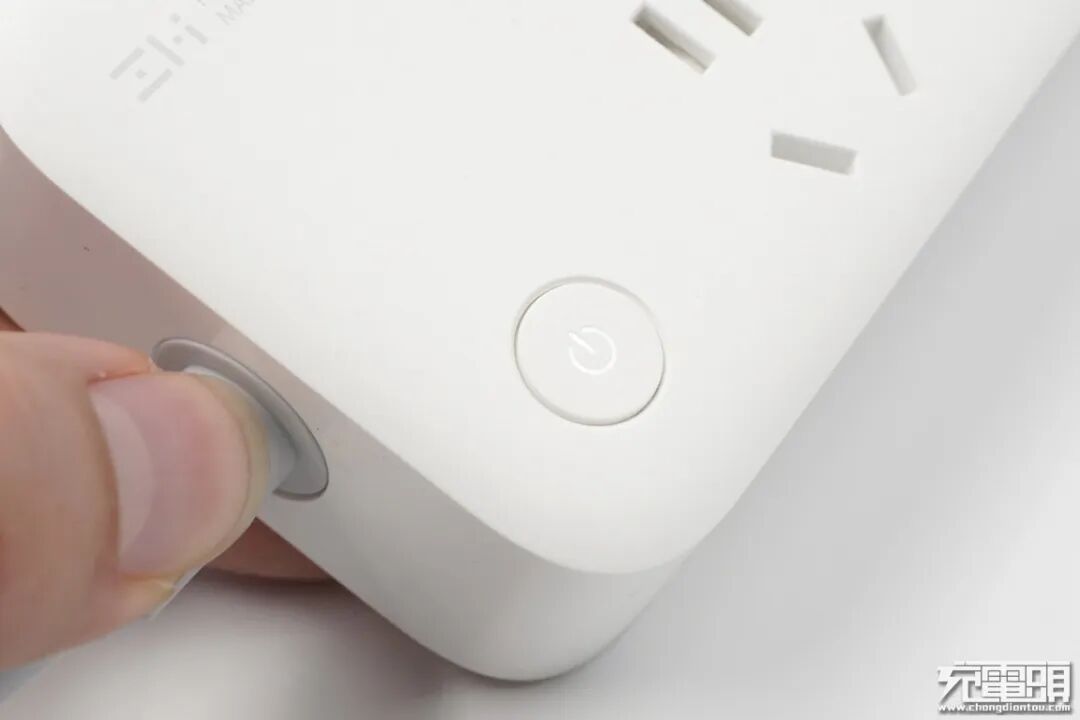 插线板使用了一个圆形轻触微动电子开关,在整个磨砂哑光面板上用亮面工艺做了一个“IO”图案,按压行程大概0.3mm手感清脆易触。