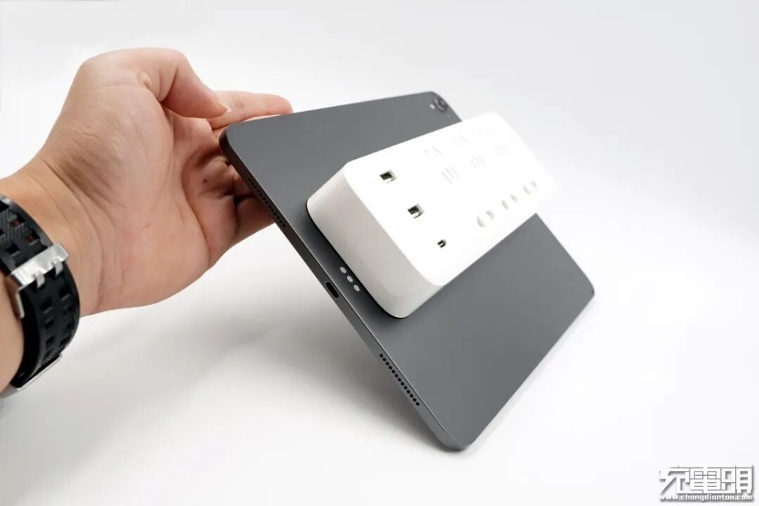 防滑垫防滑能力测试,使用iPad Pro背部作为测试面,逐渐提升坡度,紫米2A1C插线板最大可以达到100%坡度(45度)不下滑。